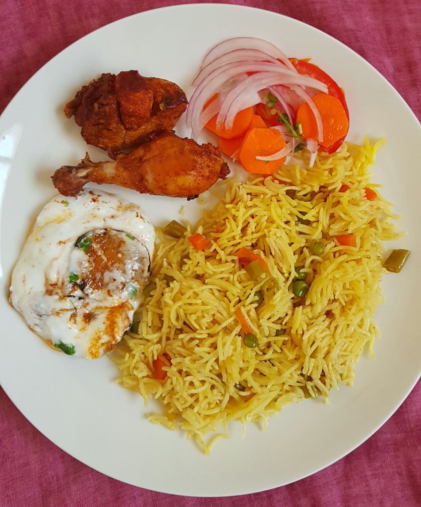 Serve the delicious veg pulao with Dahi baingan, Chicken fry & salad.