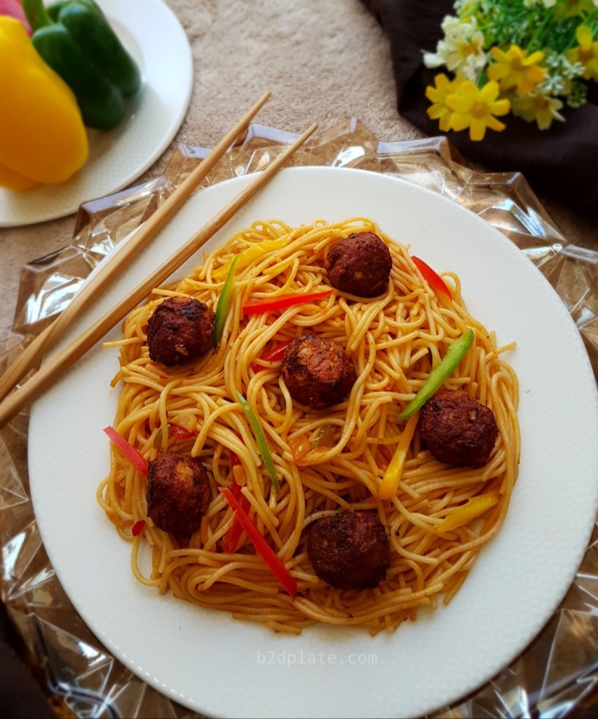This is a delicious Meatball Noodles recipe in which meatballs are dipped in tangy sauce and combined with egg noodles. I have added in veggies like carrot, green and red bell pepper. But it is completely optional. Adding eggs gives additional nutritional value ,especially if you are serving it to kids. Eggs can be avoided ,if you don’t like it ; this meatball noodles still taste delicious.