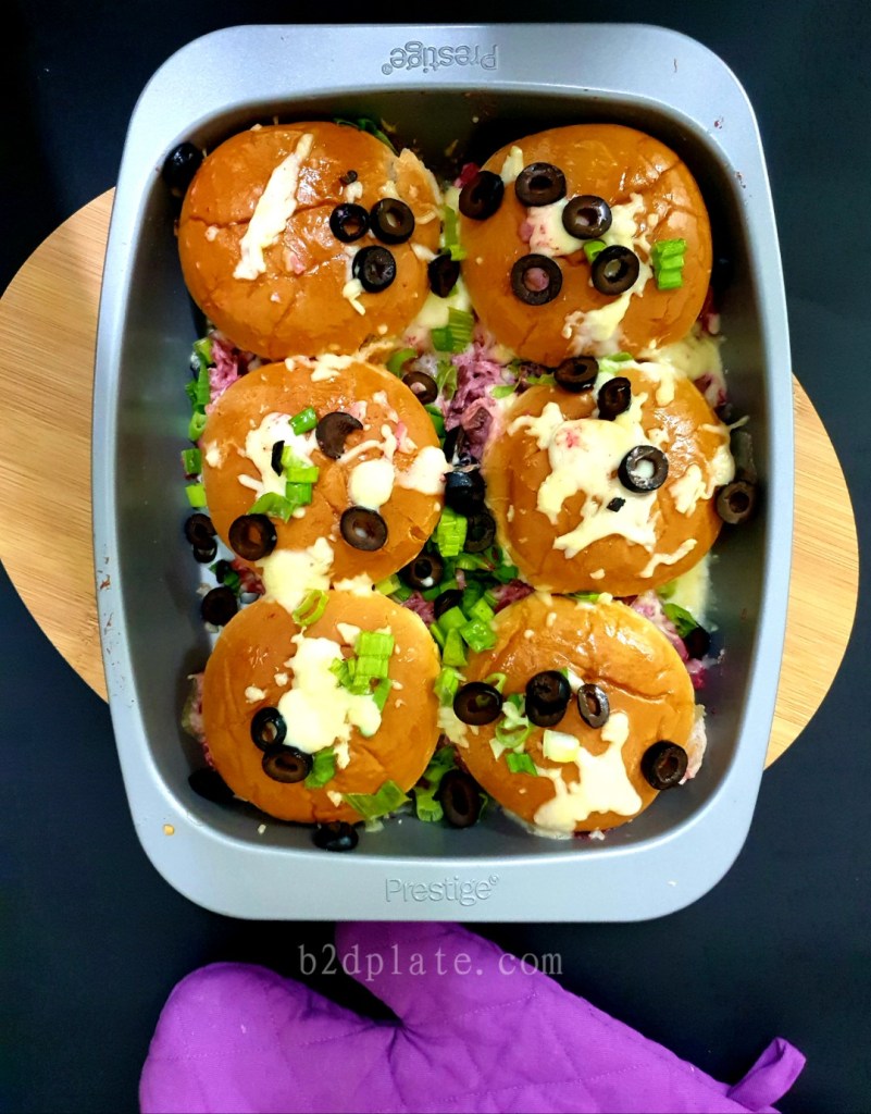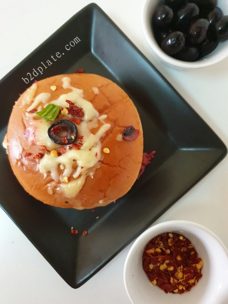 Place the filling over these buns, sprinkle some cheese, olives, spring onion. Cover it with remaining half of the buns. Sprinkle some more cheese, olives and spring onions.