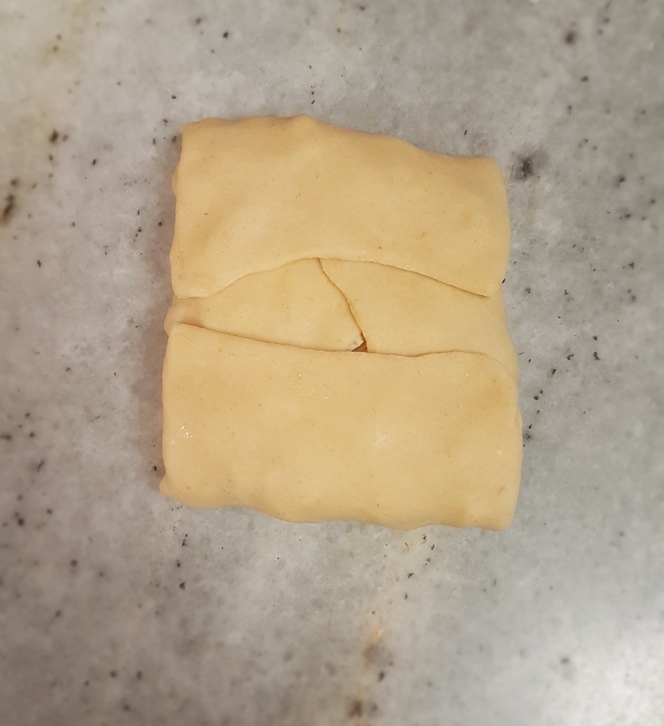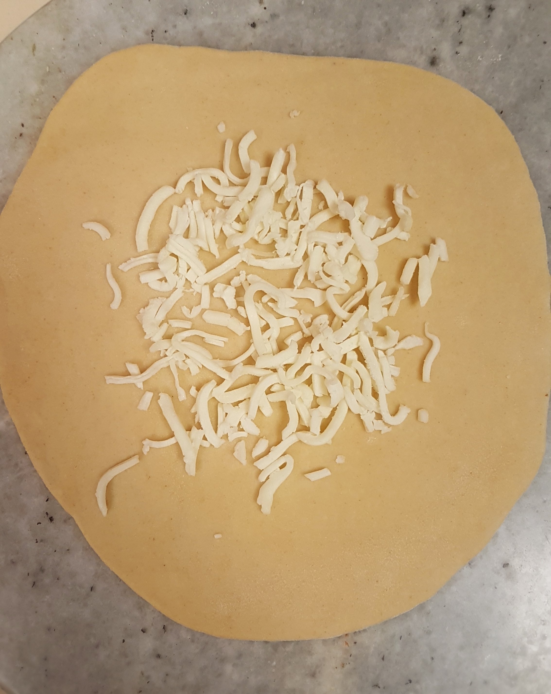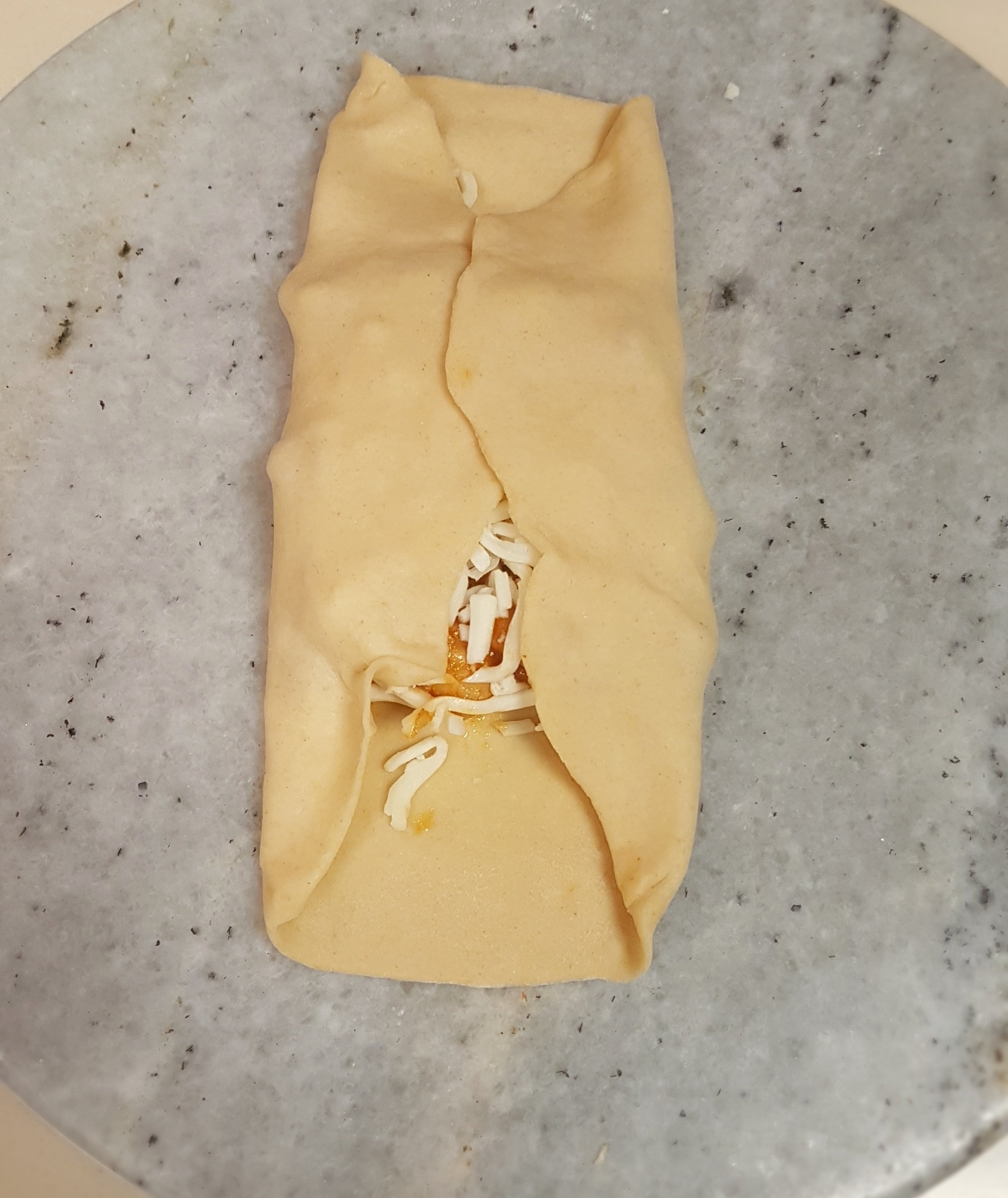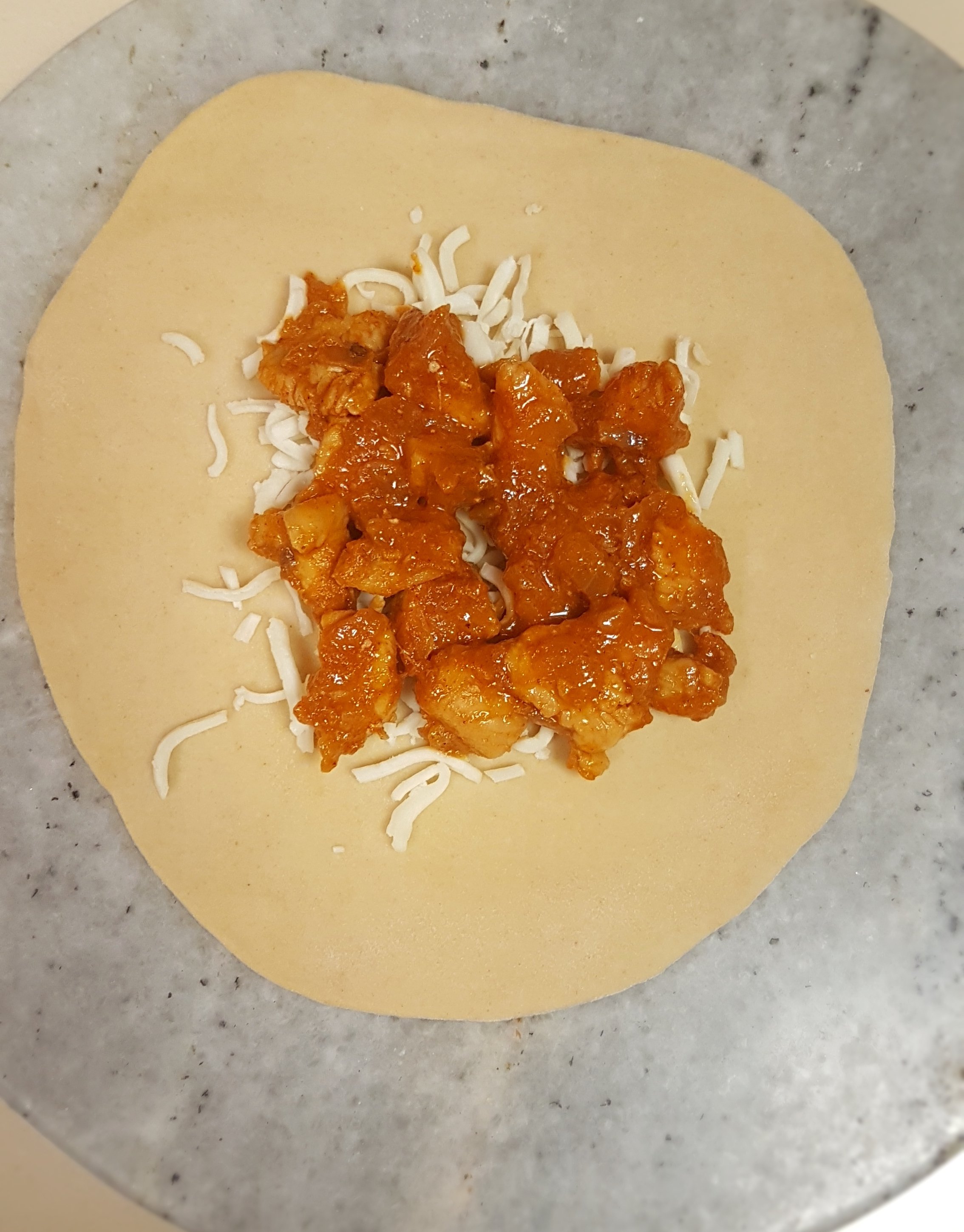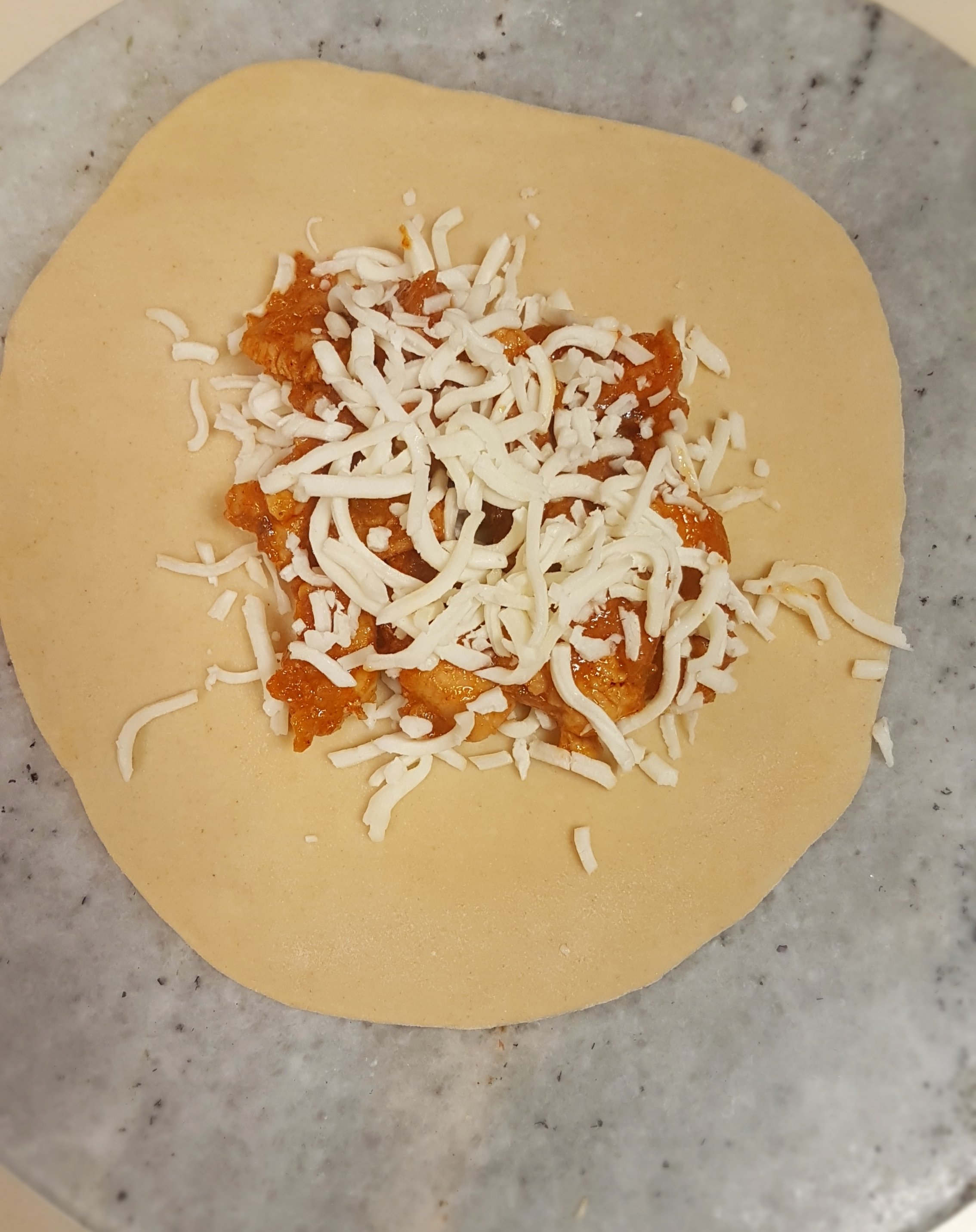 Step 2 :Place cheese, chicken filling and cheese (again on top of the filling) in the middle .