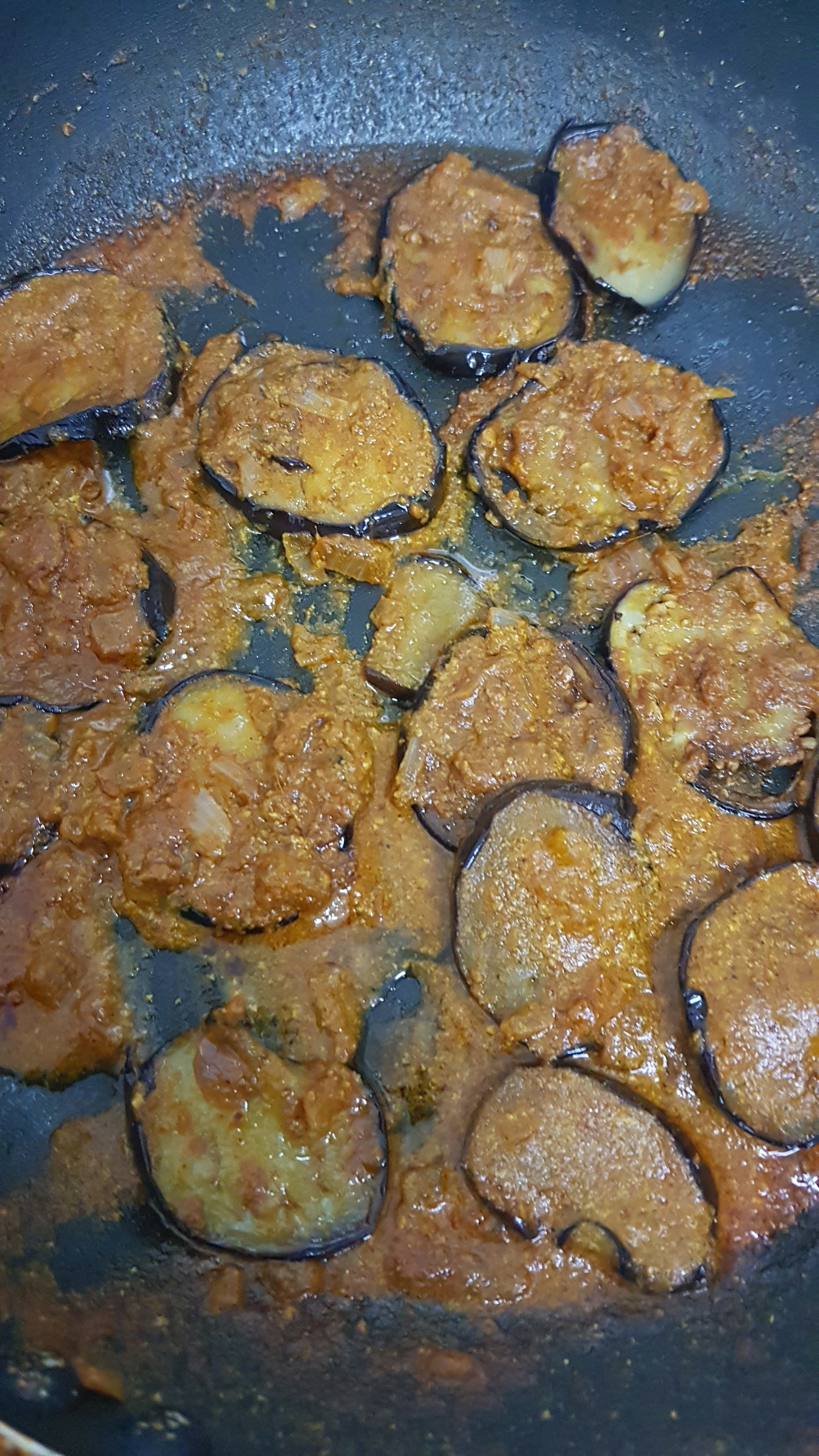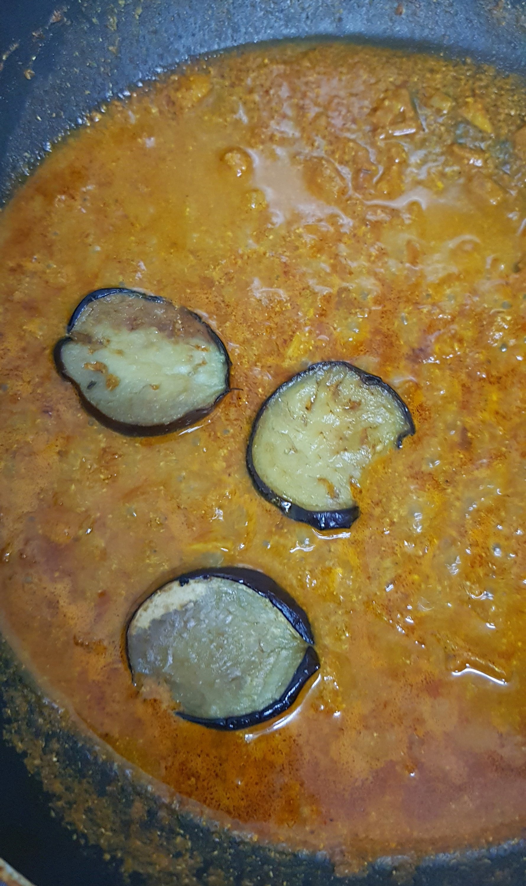 - When boils add fried brinjal , cook for few seconds, then flip and make sure brinjal is coated well with masala. Switch off the flame.