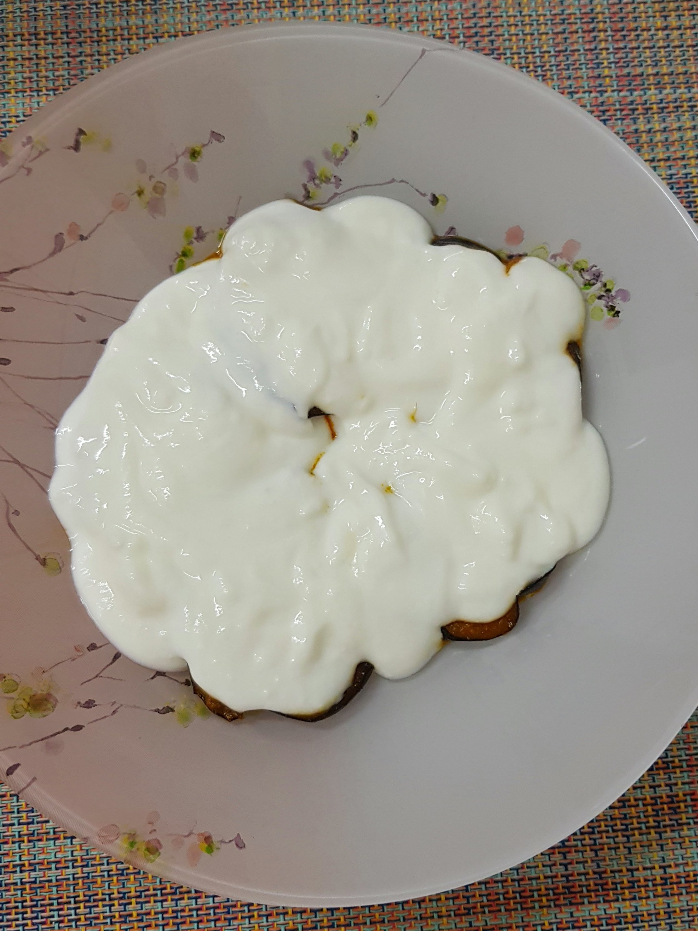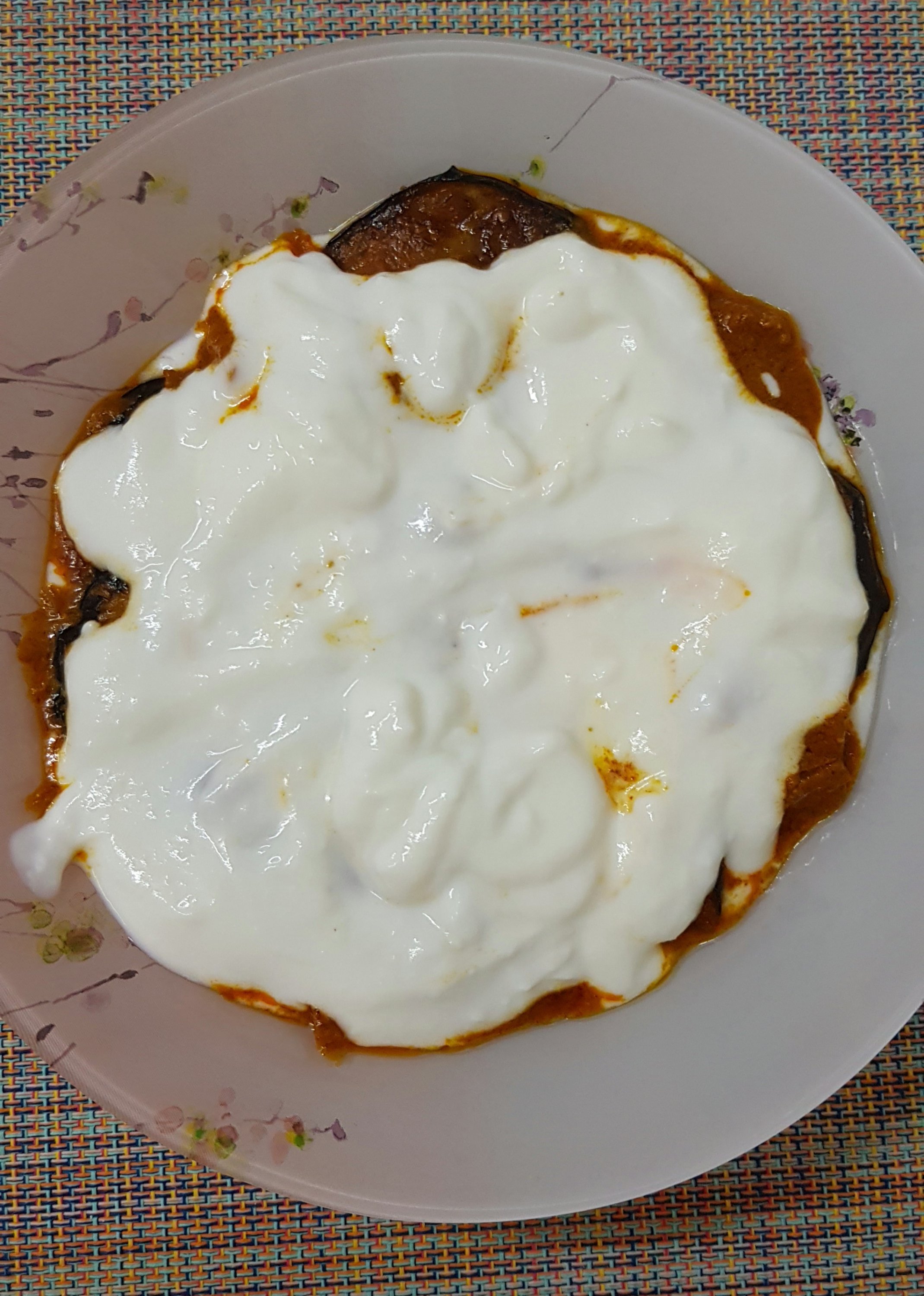 - In a serving dish, arrange half of brinjal masala, then pour half of whisked curd, then again remaining brinjal masala and curd.