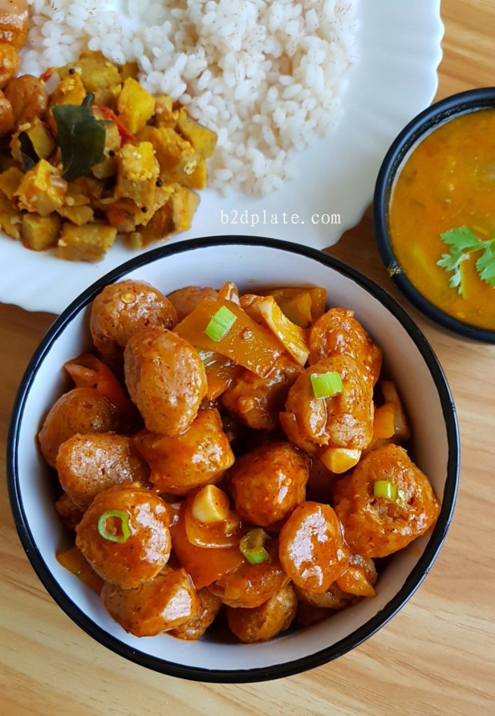 Schezwan soya chunks, a quick and delicious veg appetizer. Boiled soya chunks are marinated in spices for few minutes and shallow fried and mixed with Indo – Chinese sauce to give this juicy, tasty and protein filled schezwan soya chunks. I have shallow fried the soya chunks to keep it nutritious, which turned them into juicy in the end result.