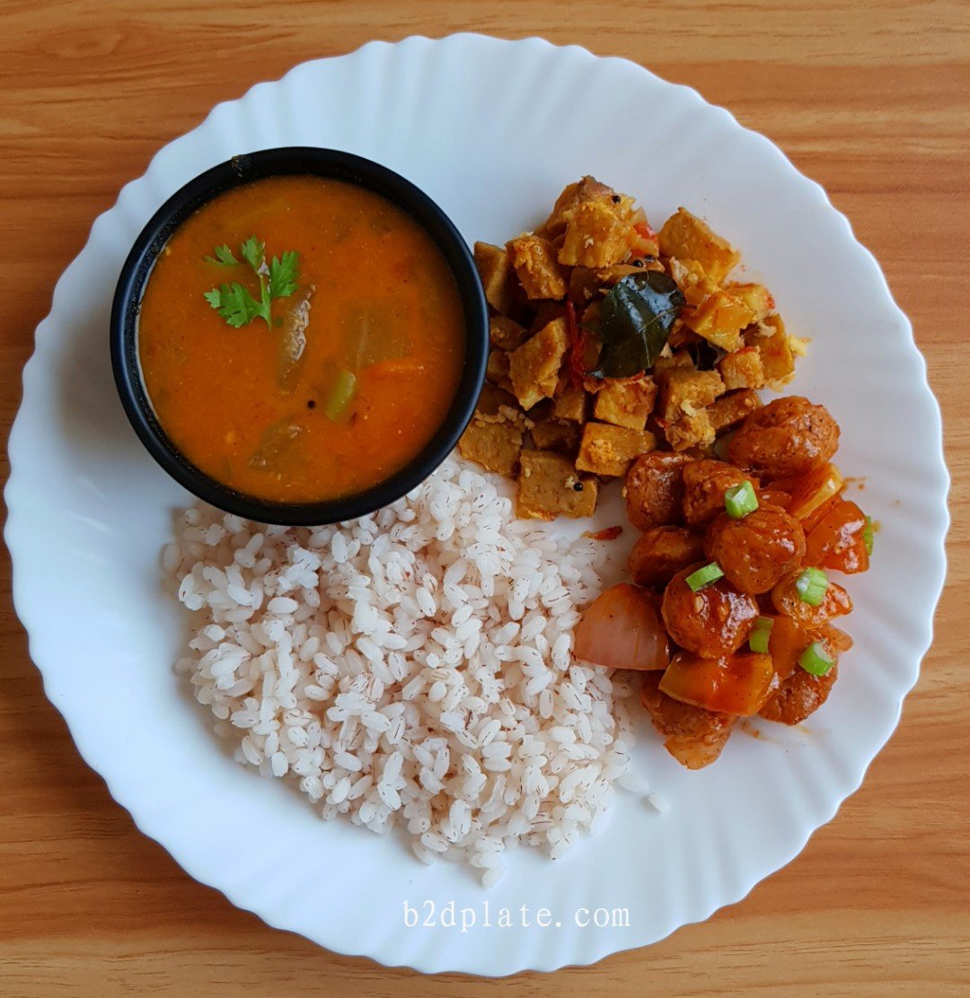 Lunch : Rice, Udupi style sambar, yam poriyal & Schezwan soya chunks.