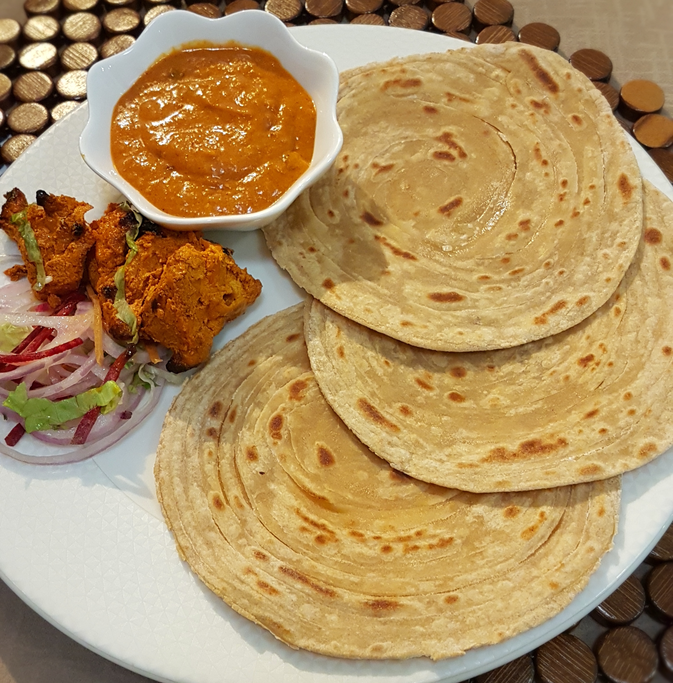 Dinner : Lachcha Paratha , left over curry, chicken kabab
