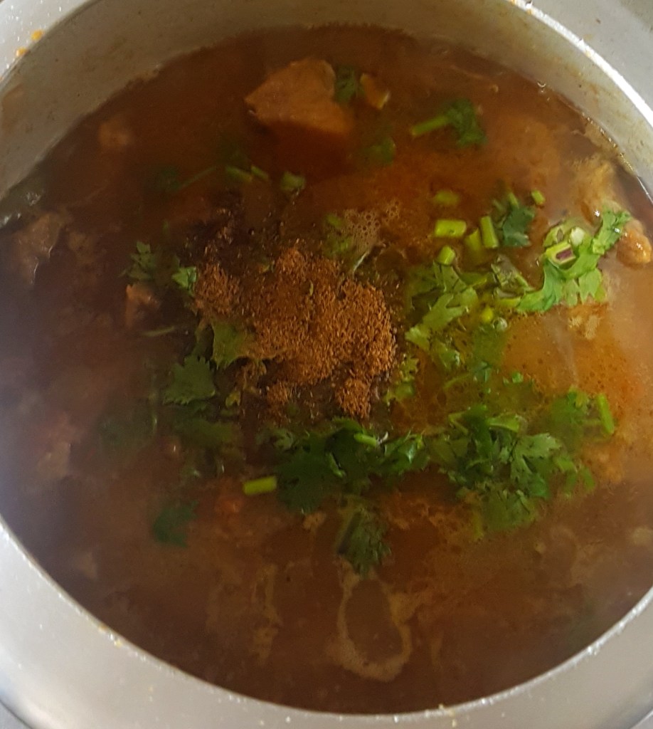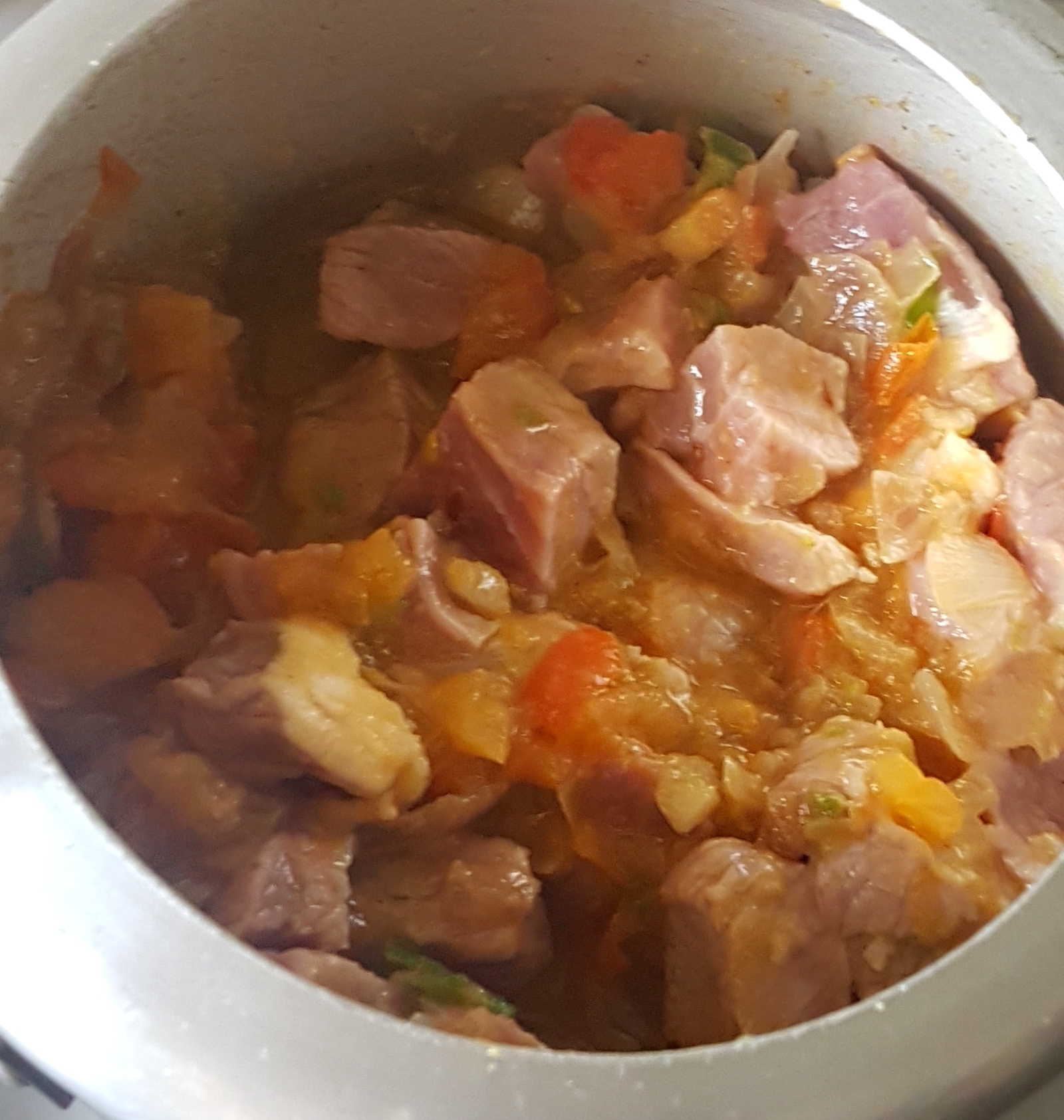 - Next, add meat and salt. give it a good mix. Pour 1/2 cup water . Combine well. Pressure cook it for about 6-7 whistles. (or as per the softness required). Switch off the flame. Let the pressure settle down.