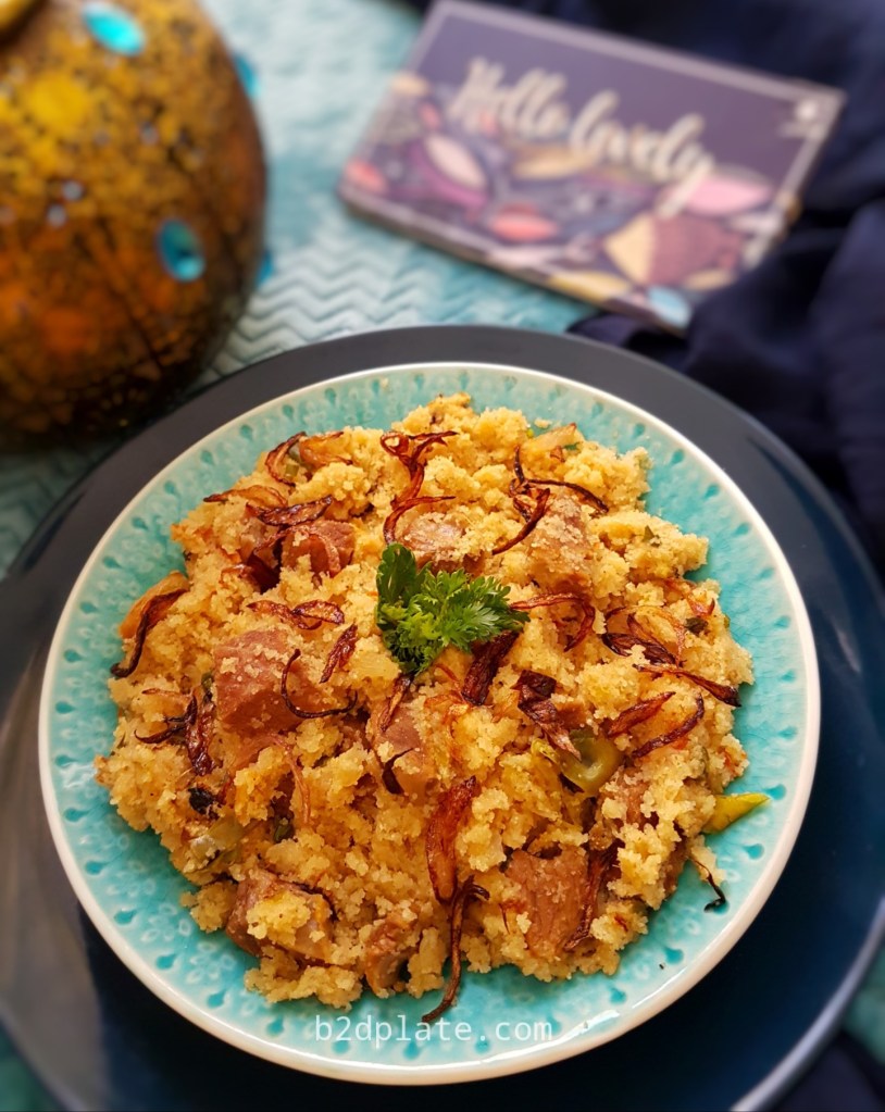 Erachi Thari Biriyani / meat semolina biriyani is a very famous authentic malabar delicacy which is also called “Thari Chor” . This dish comes all the way from Thalassery (Kerala) ,which was introduced to me by my sweet sister Rifa who got married to a Thalassery puthiyapla. The region Thalassery is famous for its rich and authentic cuisines, and the people there are famous for their lavish honoring of their guests through a wide variety of their signature dishes.
