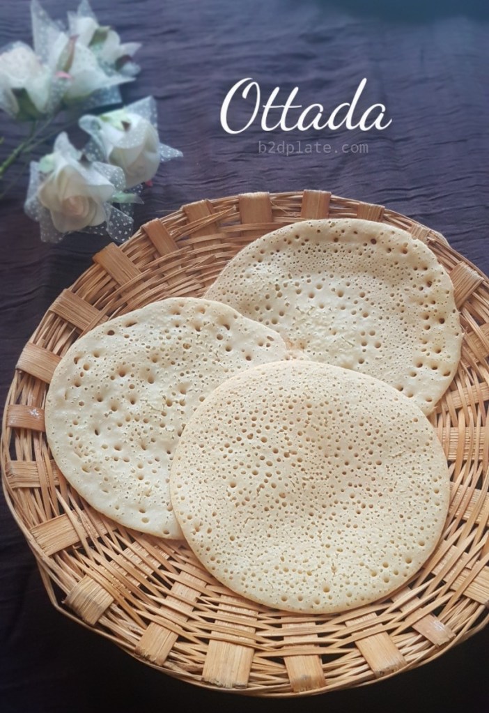 Ottada is rice pancake which is a traditional breakfast dish in malabar region. Also known as Mutta pathiri, it is very soft and fluffy. I would call it a healthy fusion of rice dosa and wheat dosa with the addition of egg. It is traditionally cooked on an earthen pan. Here , I have used a non-stick pan to cook this. It is usually served with sweet coconut milk. It tastes equally good with chicken or mutton curry as well as veg stew.
