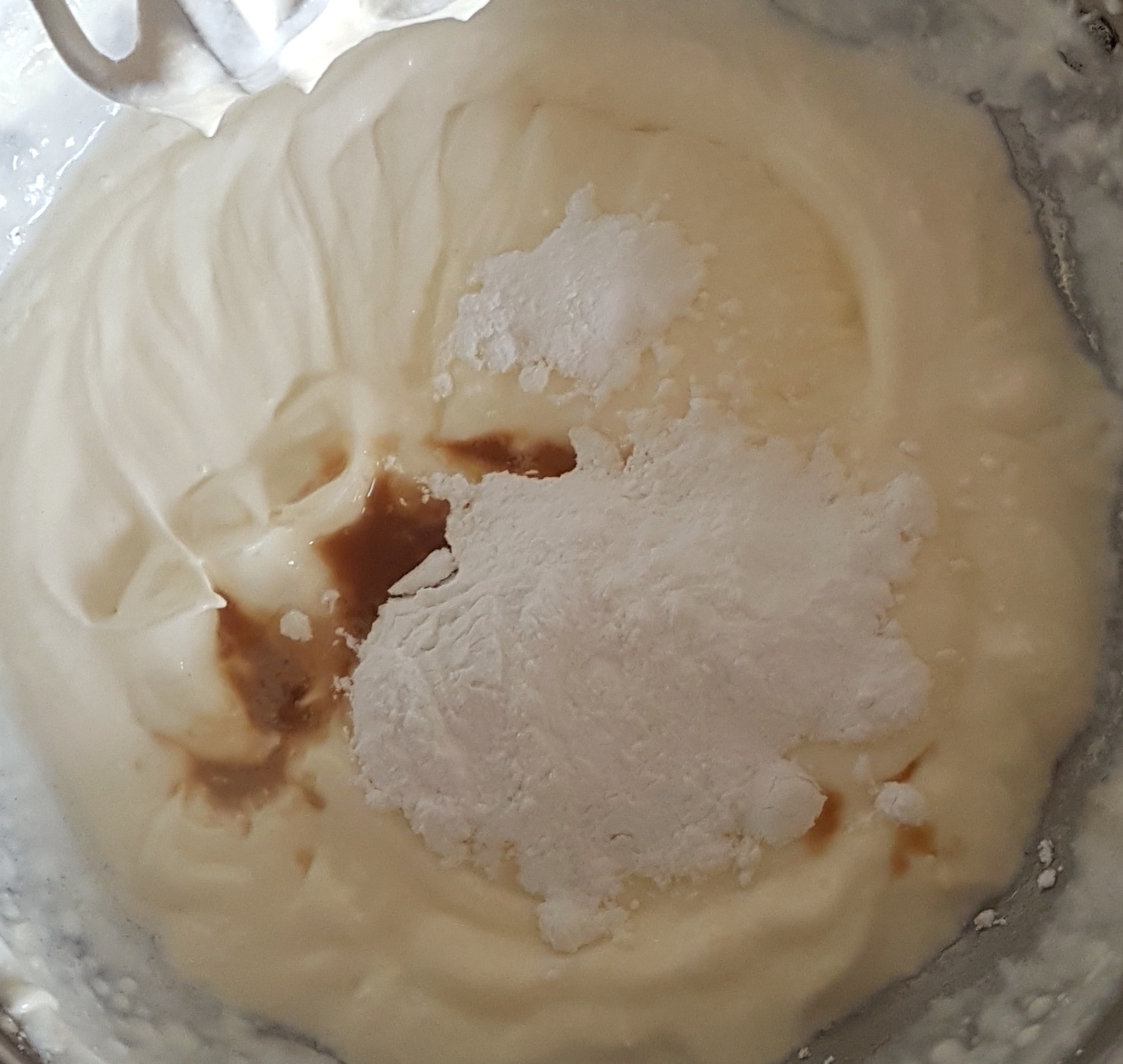 • Then add 5 tablespoon of powdered sugar and beat again until well combined. Then add 1 teaspoon vanilla essence ,fresh / tin cream , 4 tablespoon of condensed milk. Mix nicely until well combined.