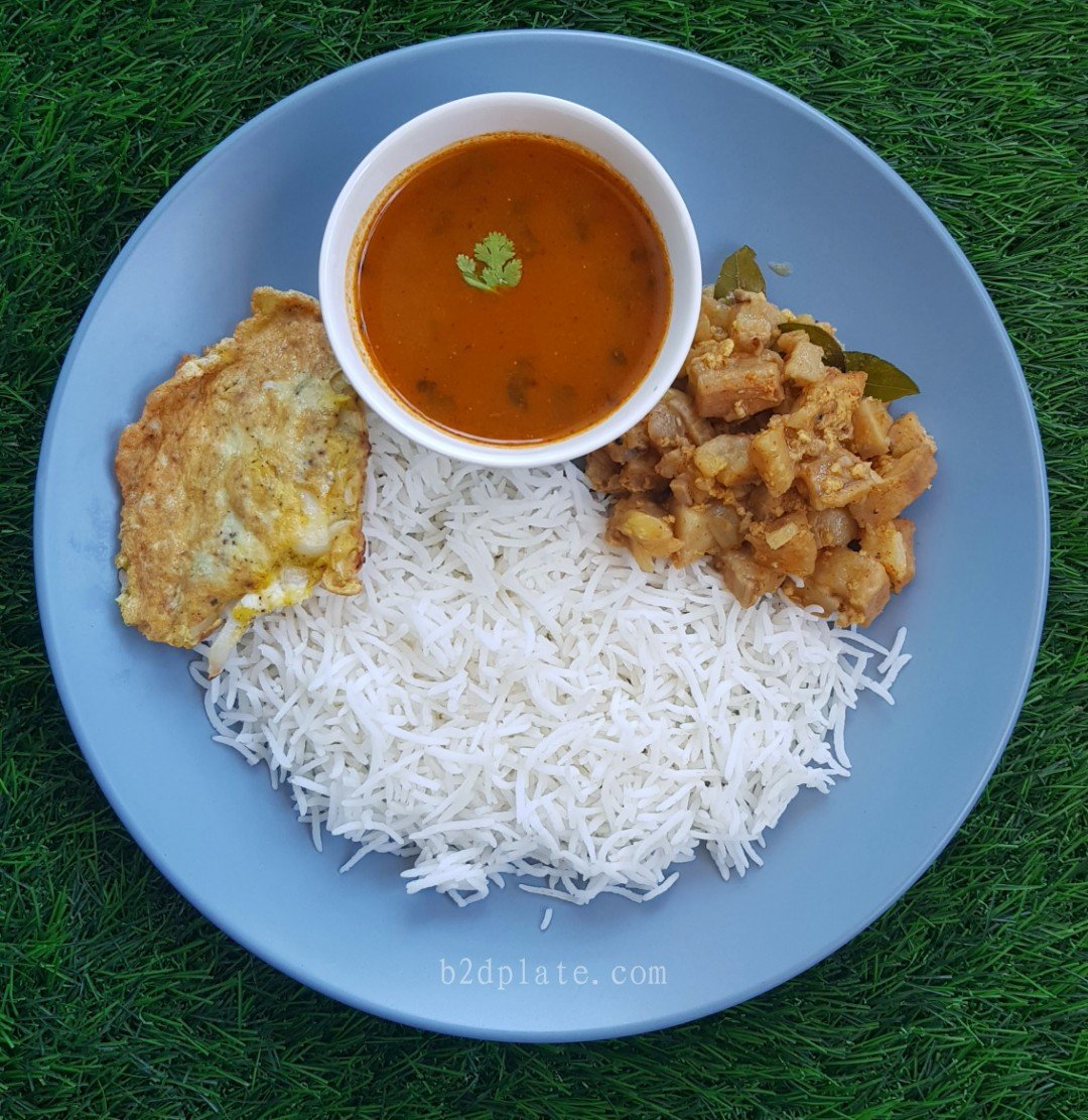 Lunch : Rice, Sambarballi / Ajwain leaves rasam, raw banana poriyal, omlette.
