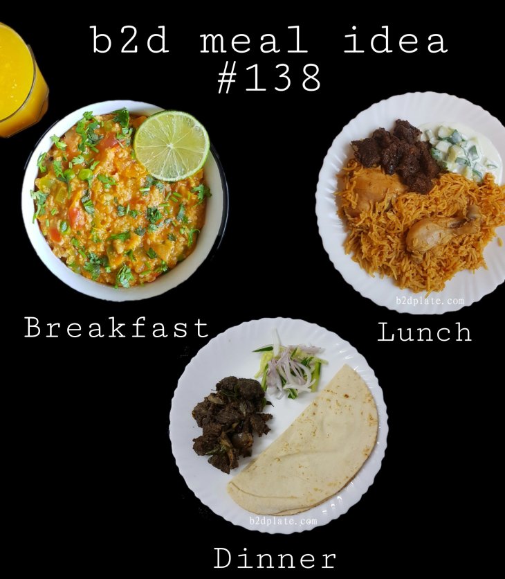 Breakfast : Masala oats & orange juice Lunch : Chicken pulao with Mutton pepper fry…