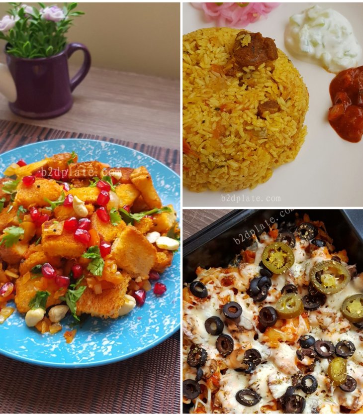 All easy peasy yet delicious recipes today 🙂 Breakfast : Bread upma topped with pomegranates. Lunch…